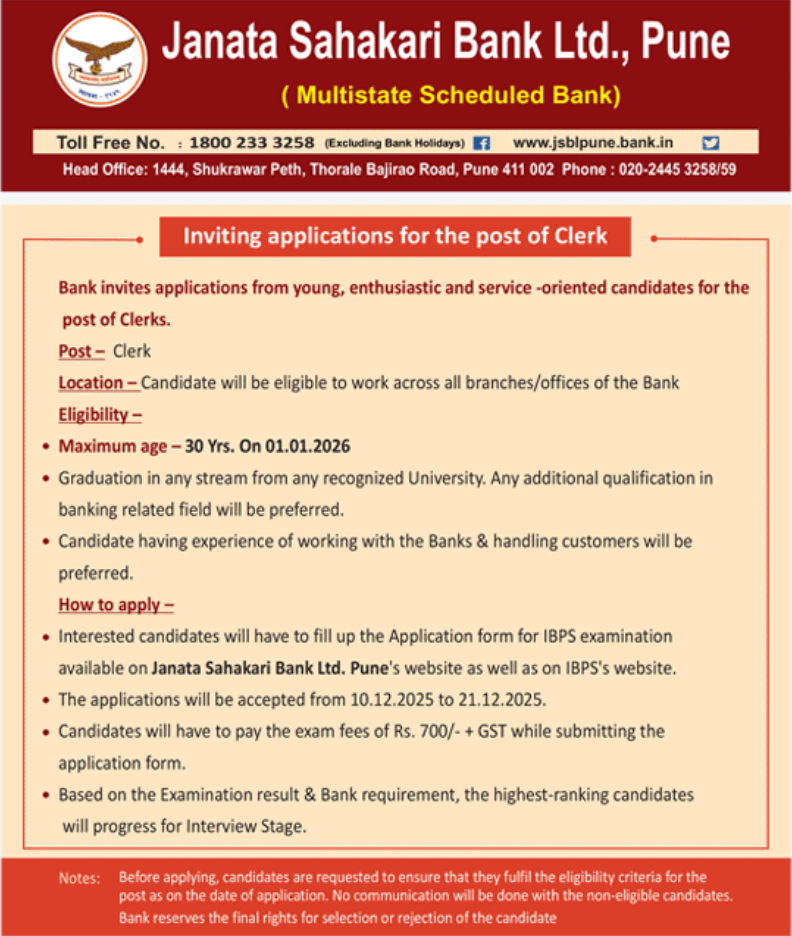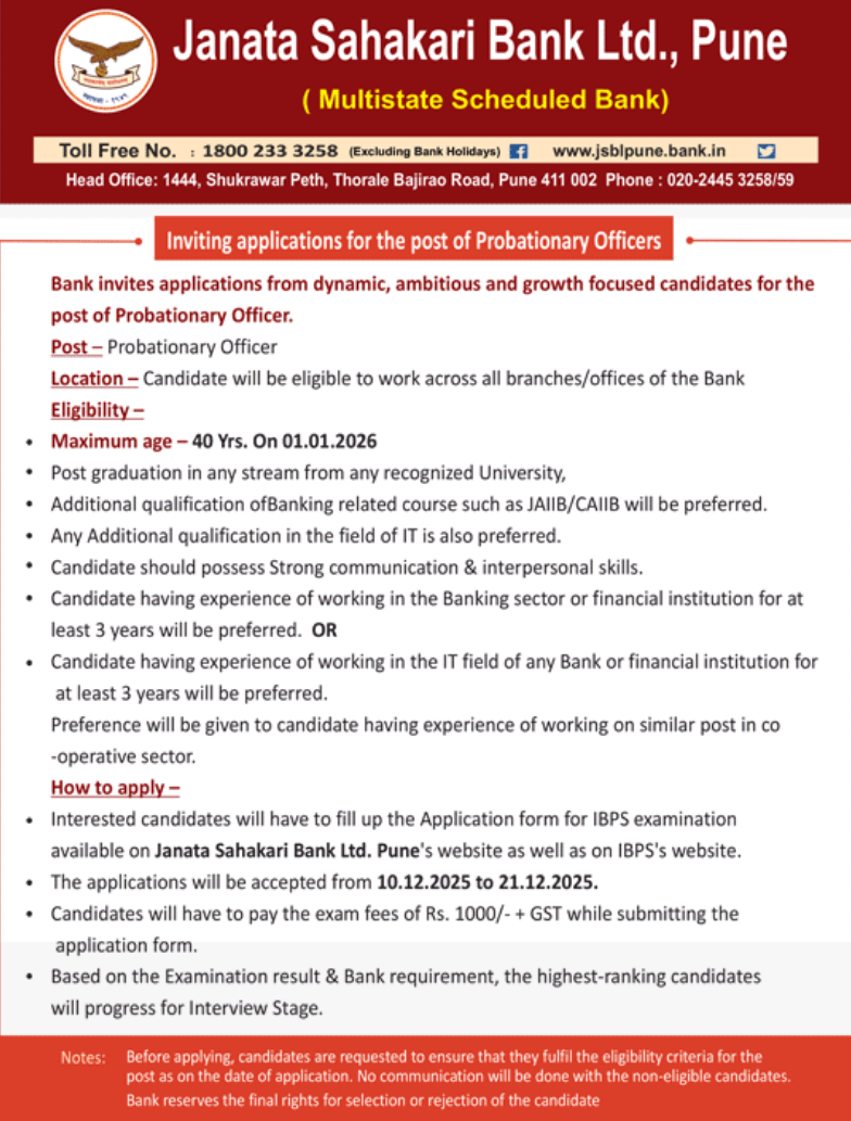 Janata Sahakari Bank Ltd. (JSBL), a reputed Multistate Scheduled Bank headquartered in Pune, Maharashtra, has announced recruitment for Clerk and Probationary Officer (PO) posts for the year 2026. The bank invites young and dynamic graduates and postgraduates to apply online through the JSBL IBPS online portal. This recruitment is open to freshers as well as experienced candidates in the banking and financial services sector. The application window remains open from 10th December to 21st December 2025. Selected candidates will be posted across various branches and offices of JSBL in Maharashtra.